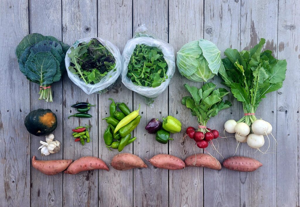 Large Share top left to right: Collards, Mustard mix, arugula, Tendersweet Cabbage, and Hakurei salad turnips, (2nd row) acorn squash and garlic, jalapenos above shishitos, Italian peppers, bell peppers, and Red rover radishes, and sweet potatoes across the bottom.