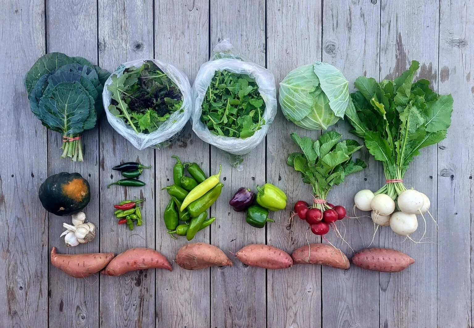 Collards, Mustard mix, arugula, Tendersweet Cabbage, and Hakurei salad turnips, (2nd row) acorn squash and garlic, jalapenos above shishitos, Italian peppers, bell peppers, and Red rover radishes, and sweet potatoes across the bottom.