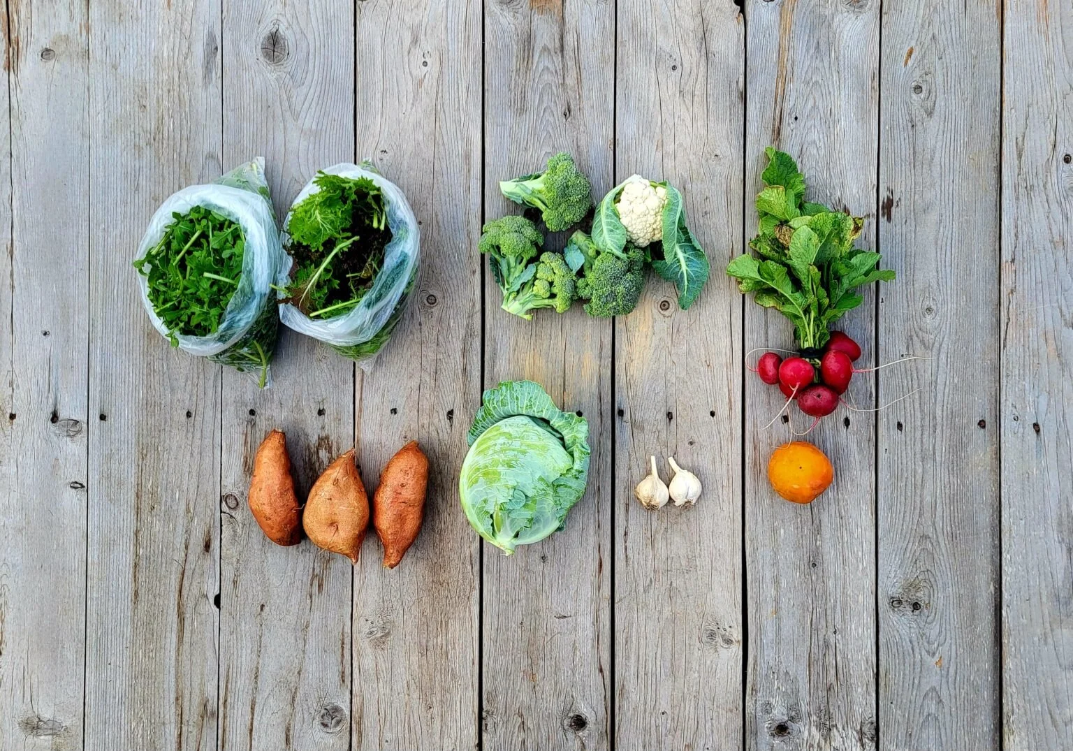 Collards, Arugula and Mustard, cabbage, (2nd row) broccoli and cauliflower, sweet potatoes, purple top turnips, acorn squash above persimmons, garlic, and radishes