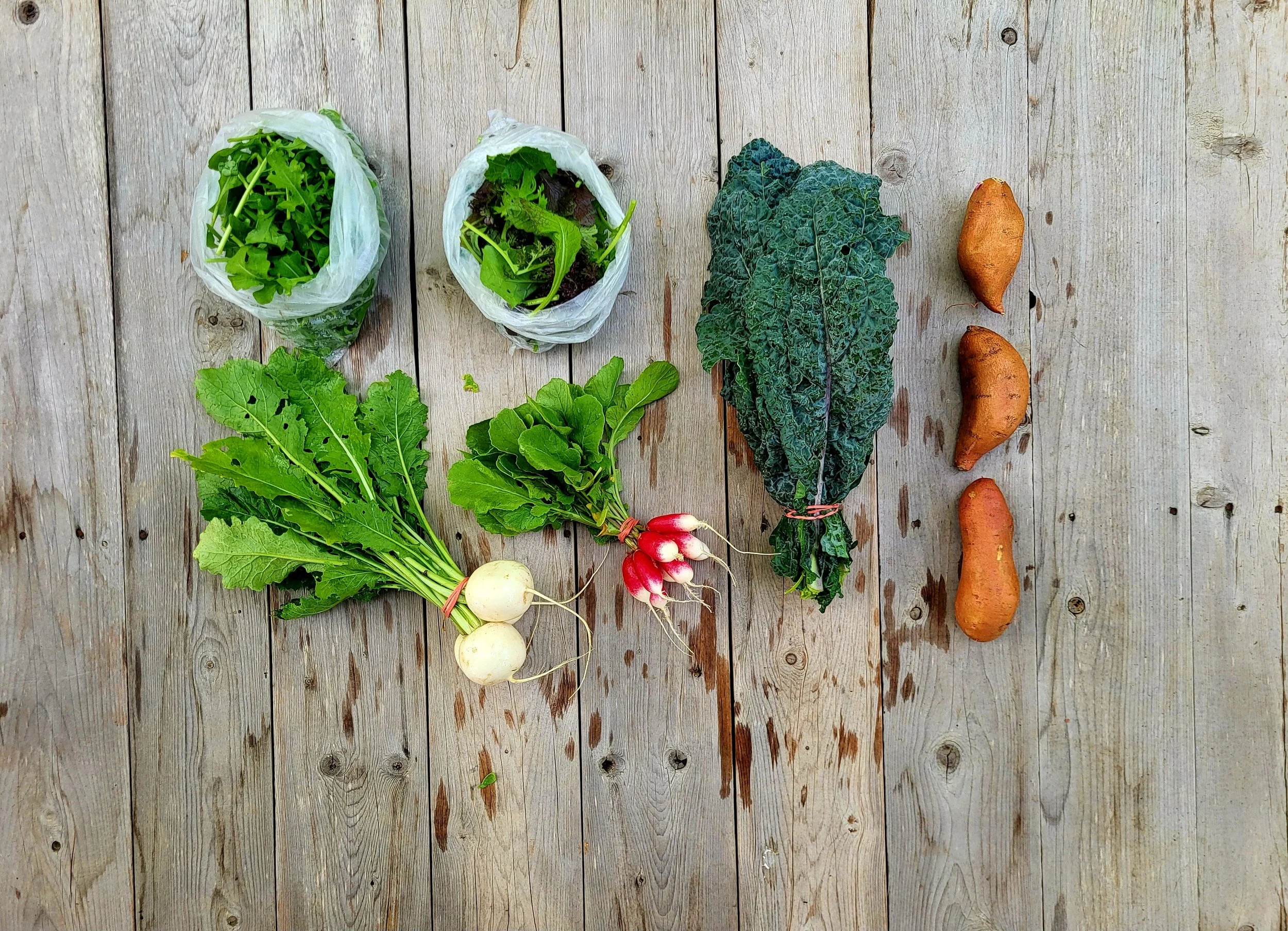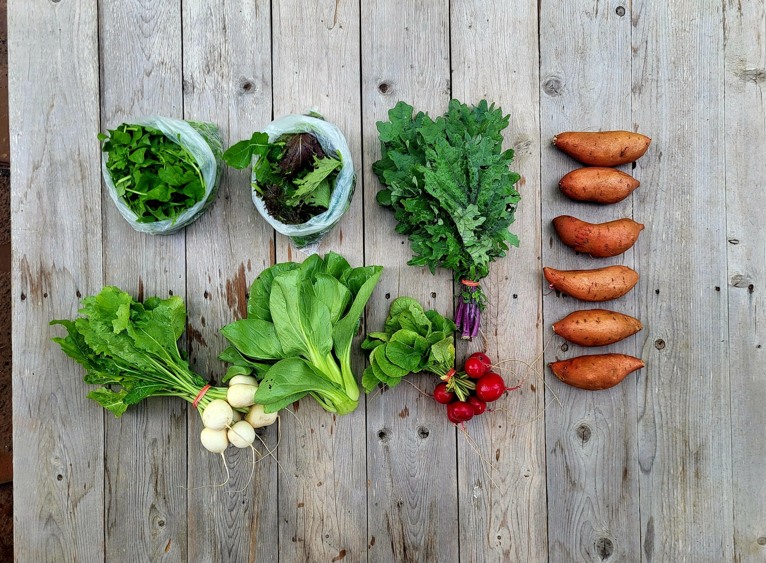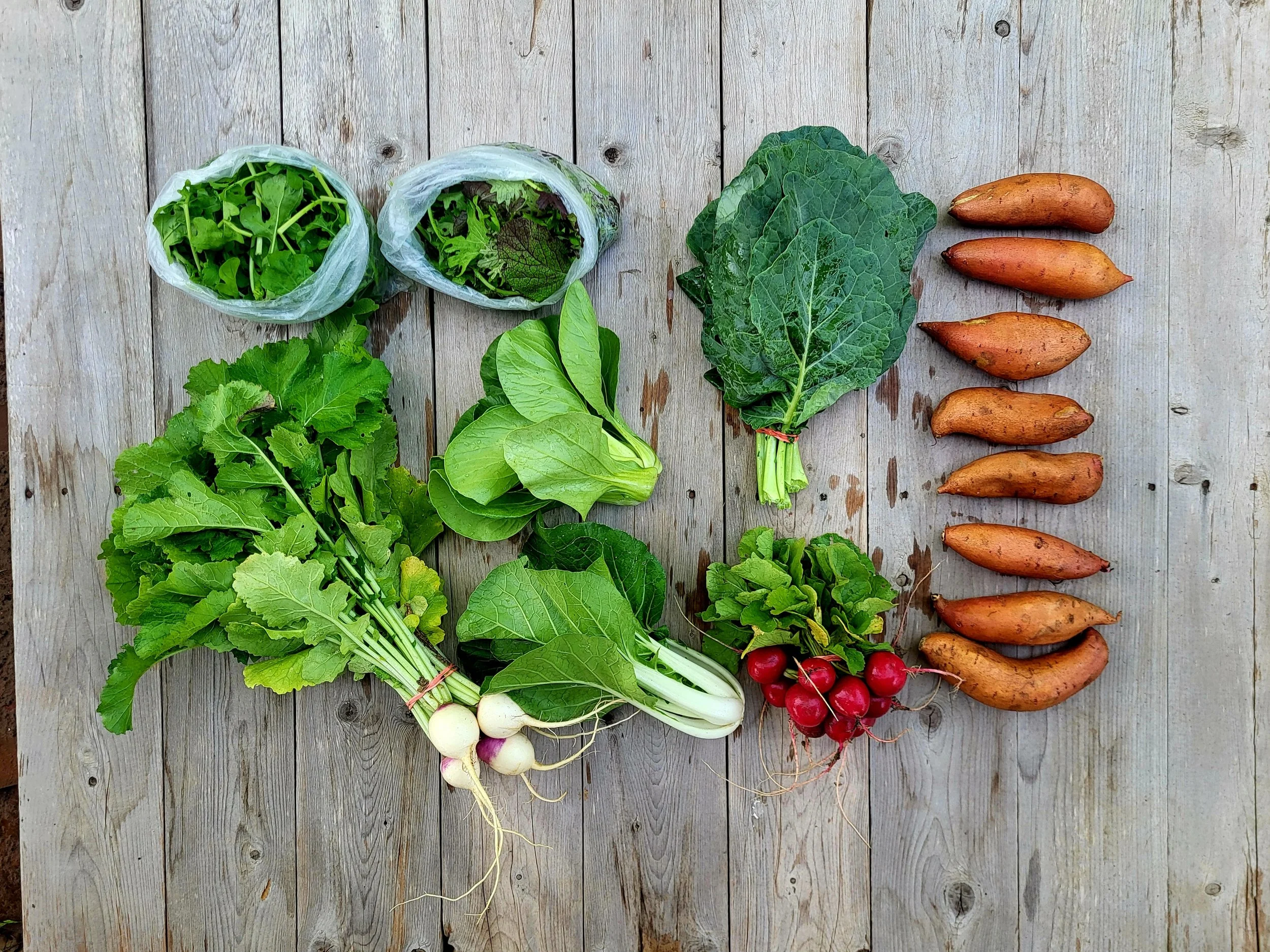 Arugula, Asian Spring Mix, Collards, Sweet potatoes down the side, (bottom row) Hakurei turnips, 2 pac choi, Red Rover radishes