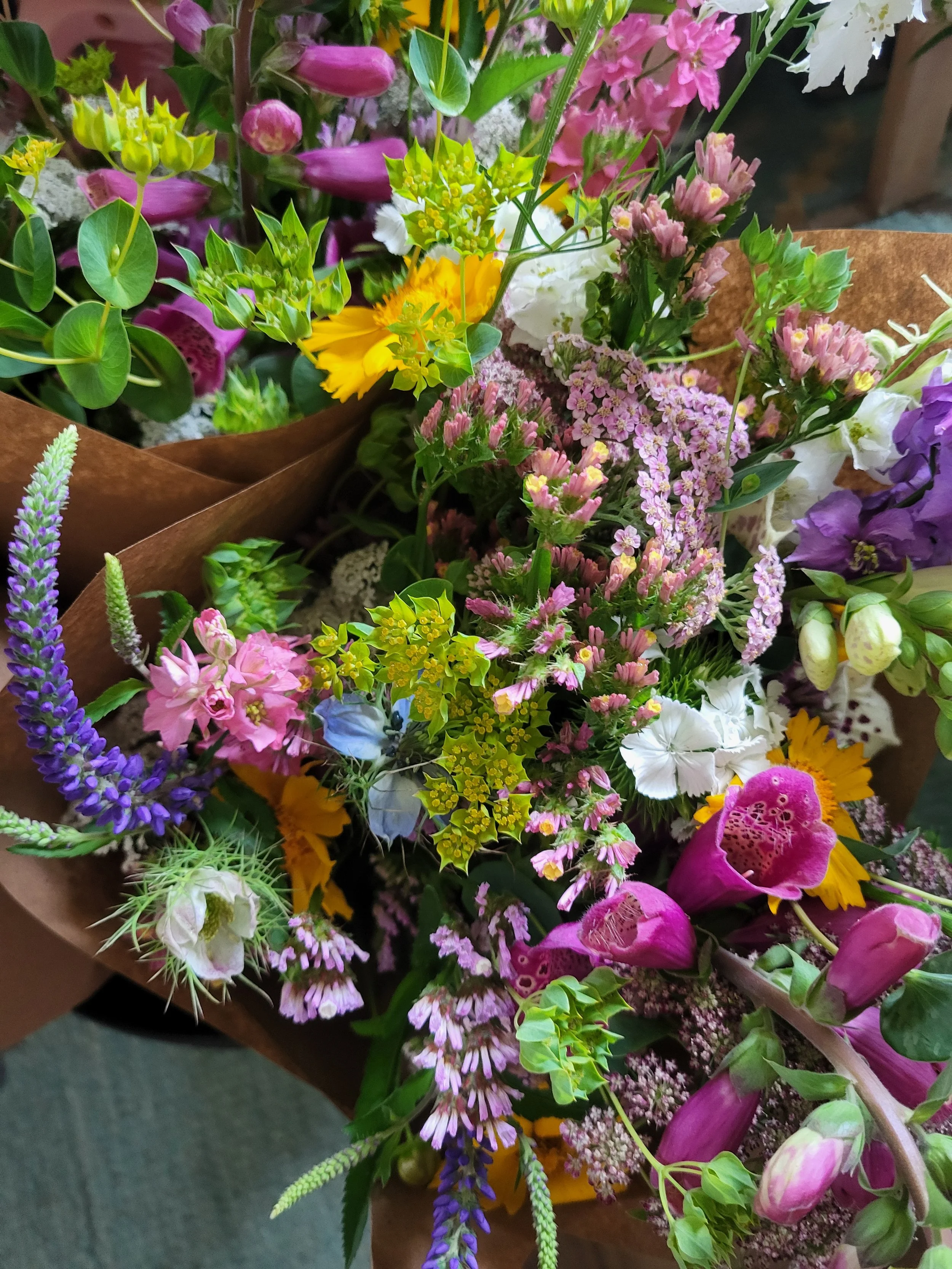 The first bouquets of the year include the last of the beautiful foxgloves and larkspur, buplurum for greenery, statice, queen anne’s lace, veronica, yarrow, dianthus. The first Nigella and Cosmos are ready this week, too. The blooms will change a lot over the next few weeks as the first crops fade and new crops come ready. We hope you love each week!