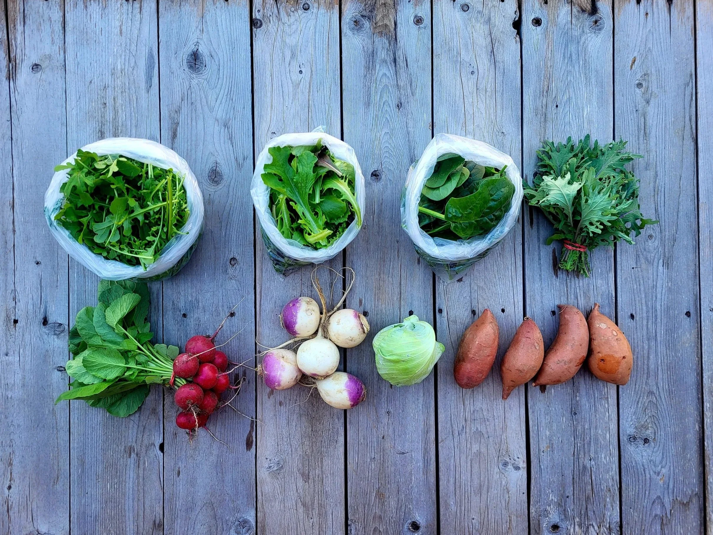 Top row, left to right: Arugula, leaf lettuce, spinach, and bunched kale (2nd row) Radishes, purple top turnips, cabbage, and sweet potatoes.