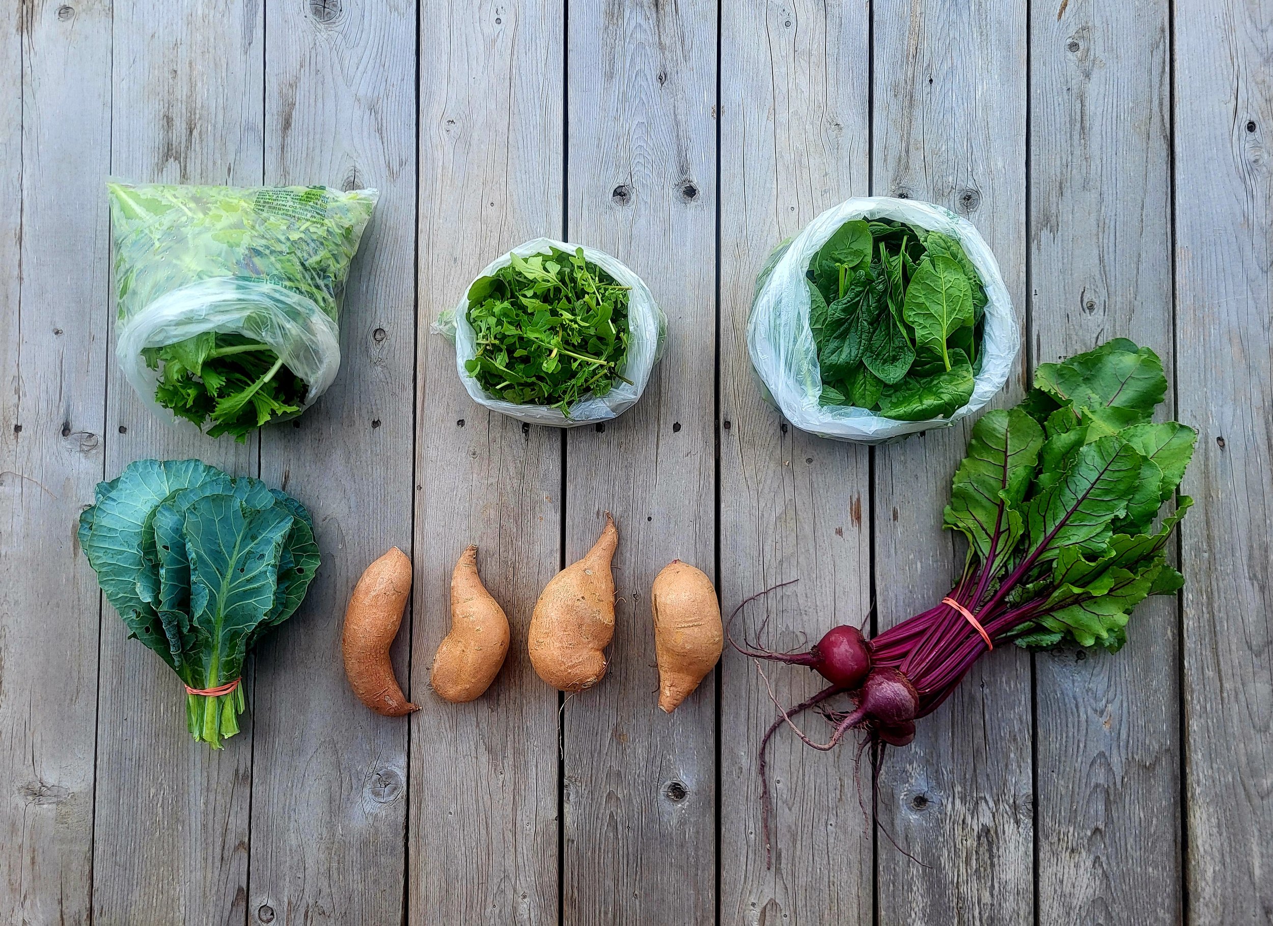 Large Share top left to right: Leaf lettuce, arugula, spinach, (2nd row) Collards, sweet potatoes, and beets.