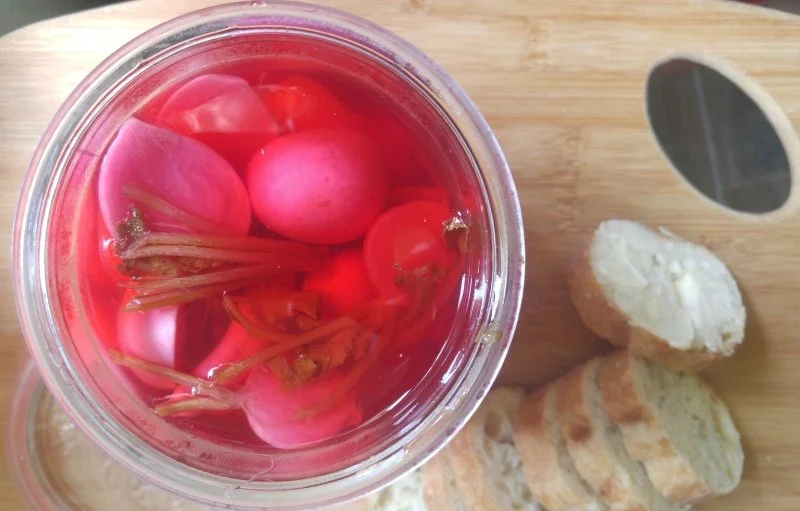 Allow jar to cool to room temperature before placing in the fridge. In a day or two, the radishes will be pickled, though still crisp. You can slice the radishes quite thin, though you will not have quite as crisp an end result.