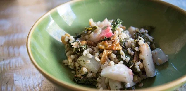 Meanwhile, cook the pearled barley. Simmer the barley in 1-1/2 cups of water until tender and all the water is absorbed. Toast the walnuts in a dry saute pan over medium heat, tossing constantly until the nuts turn golden and start to be fragrant.