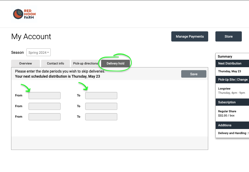 Vacations and delivery suspensions. When planning a vacation, please remember that as a member of our CSA, you agree to pay for each week of the season whether or not you can pick up your share. If you’ll be out of pocket on a delivery day, we encourage you to find a friend who could pick up and use your share that week. However, if you can’t find someone to look after your vegetables, you can set delivery suspension dates within your member account, and we will donate your share on those weeks so that nothing goes to waste. Please update your delivery suspension dates in your account by noon on the Tuesday before the delivery date in question.